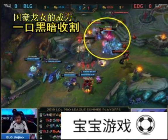 在这场比赛中,带着黑暗收割的国豪基本上一口痰就能喷掉对面IBOY大半管血,效果堪比核武器。对面在龙女变形的情况下根本不敢守塔,一路被BLG给平推了。