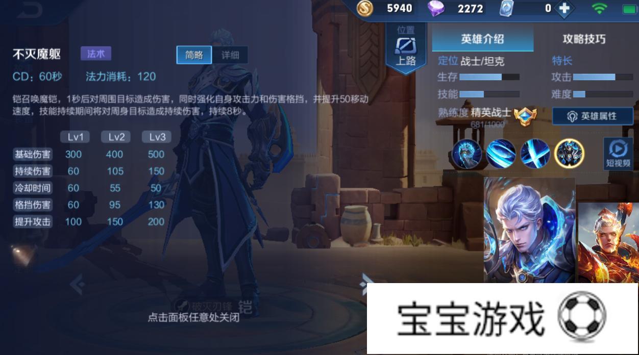 3,三技能 · 不灭魔躯,召唤魔铠来临,也就是这个一开大,就觉得你能1打5的神技了,所以能力都加强,并还有法术伤害。